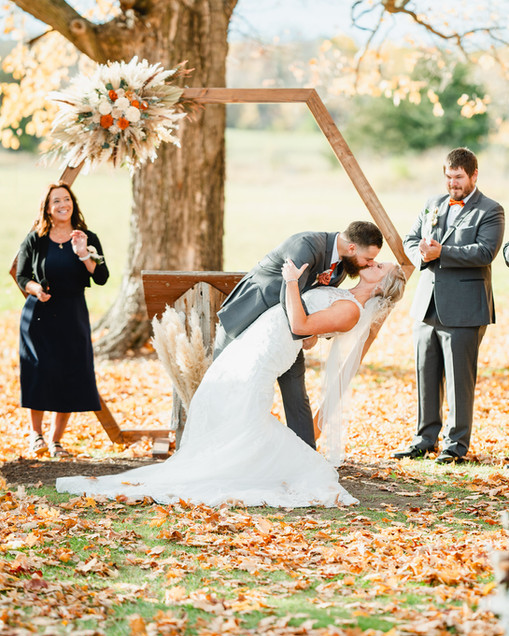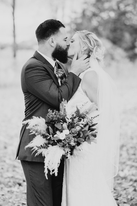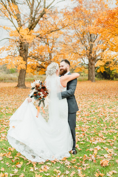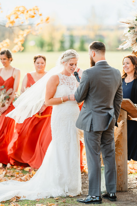 As I made my way to the farmhouse at Maple Ridge Farm, I selected a few perfect leaf specimens to include in Allie's detail photos. Imagine my joy when I walked into the bridal suite and saw the stunning dried flower bouquets (that she made herself!) sitting on the side table. Plus a row of bridesmaids dresses in a warm, red orange that couldn't have been a better match for the trees putting on a show all around us. The energy was calm - hair and makeup finished with an hour to spare, and all of Allie's ladies hanging out, listening to a playlist they had all contributed to, complete with the Harry Potter theme song, which just felt right for October.